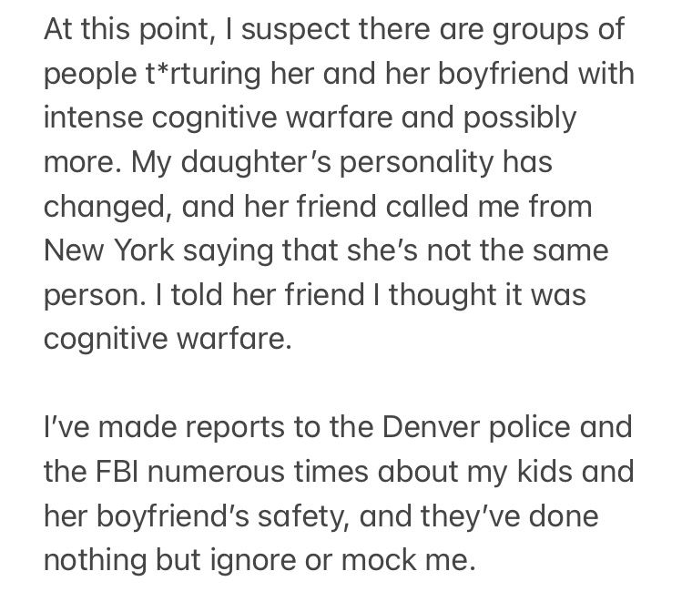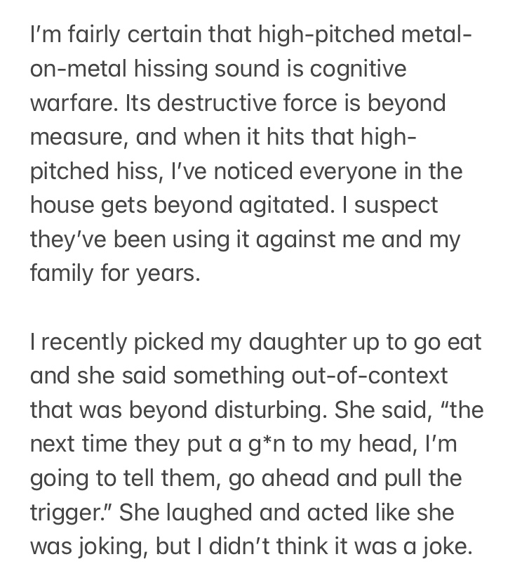 I DON'T KNOW IF THESE ARE CONNECTED, BUT I BELIEVE MY KIDS, my daughter's boyfriend and ME HAVE BEEN THE TARGETs OF COGNITIVE WARFARE